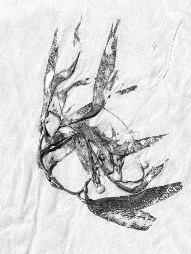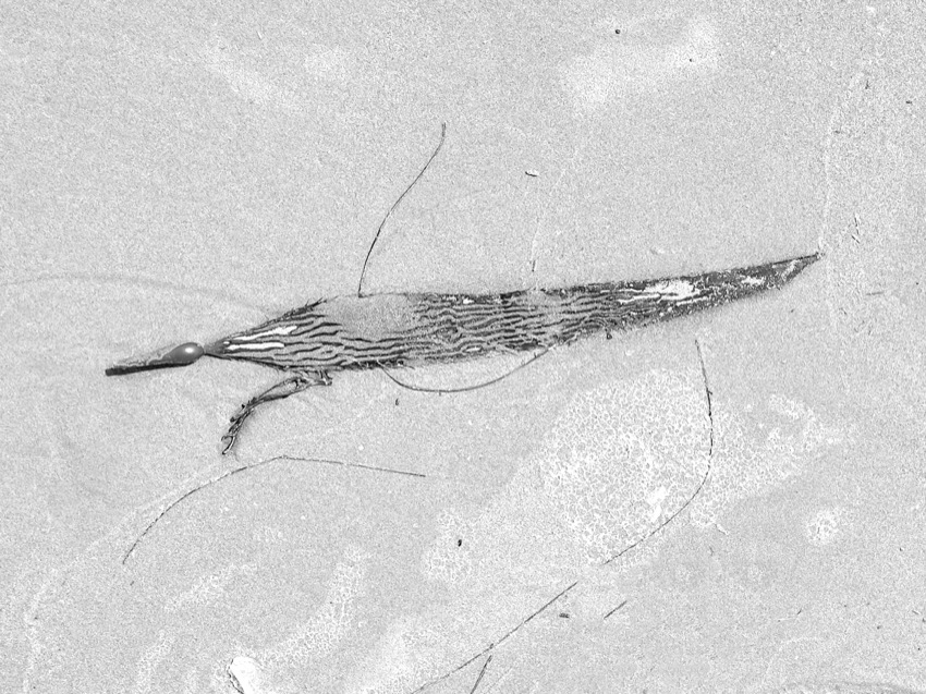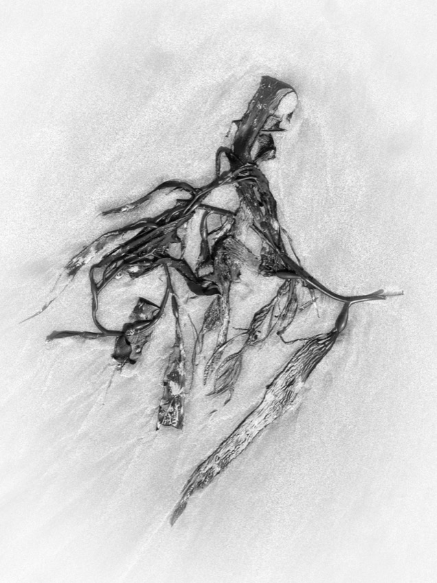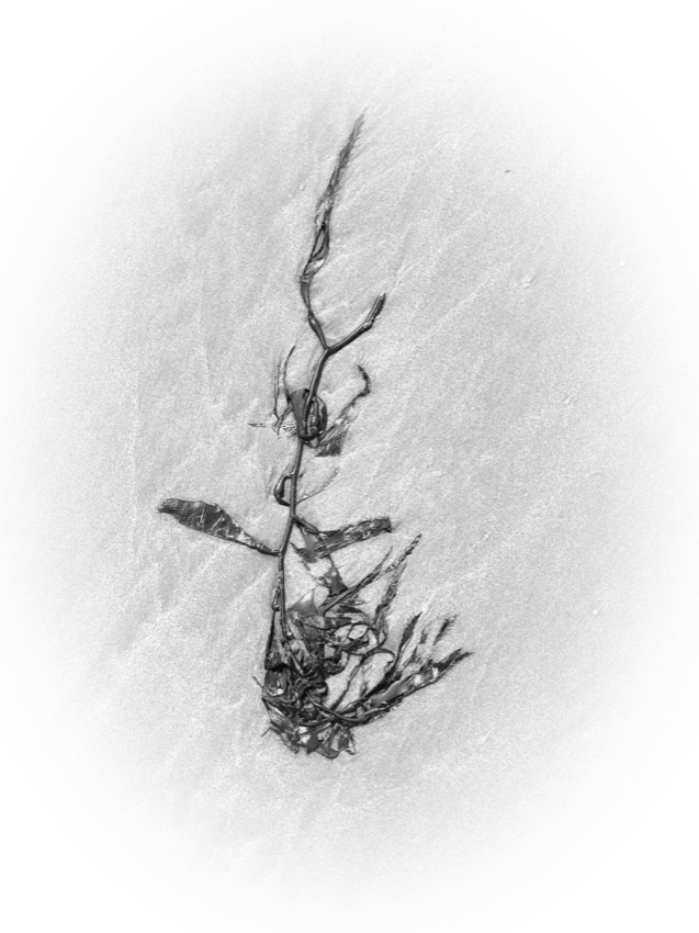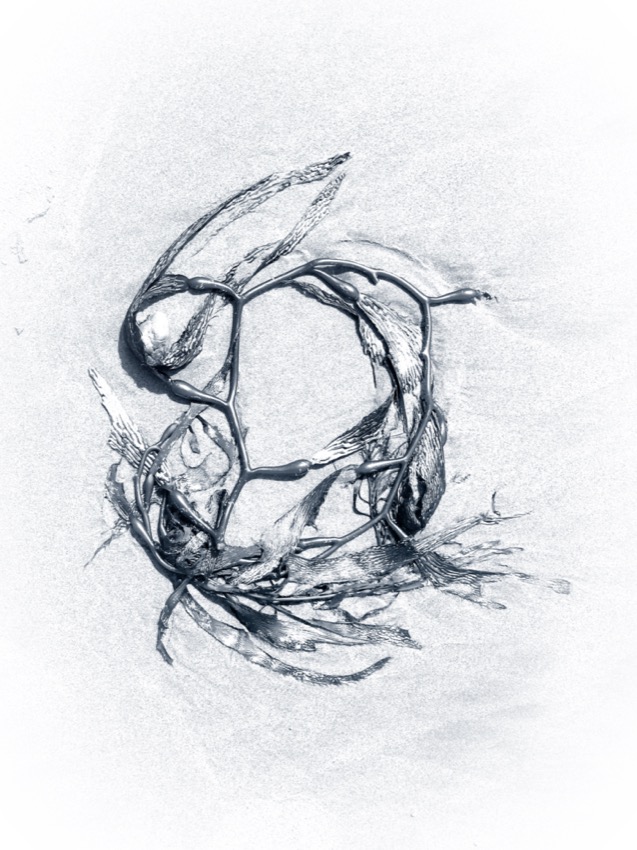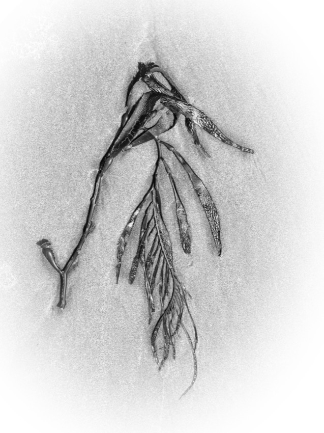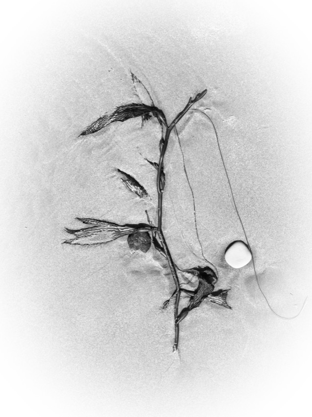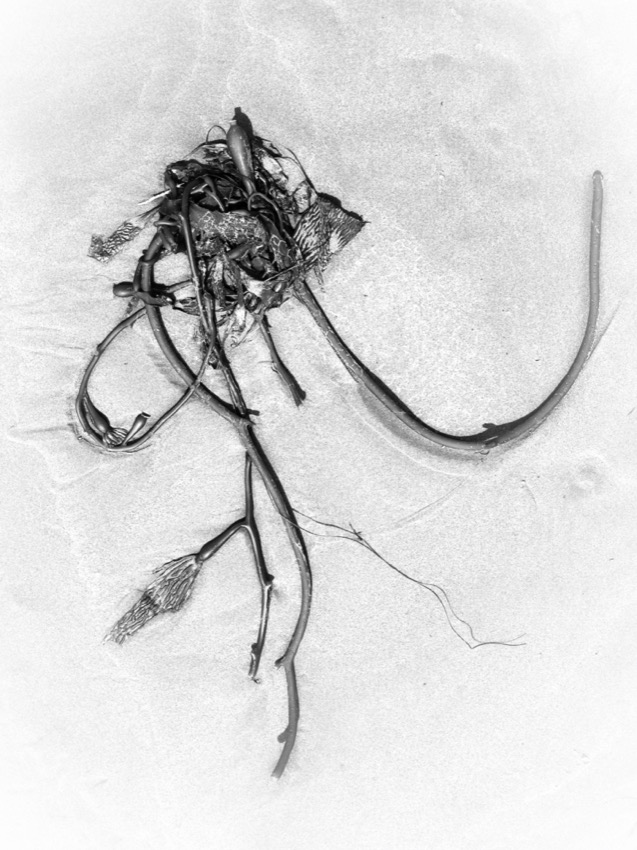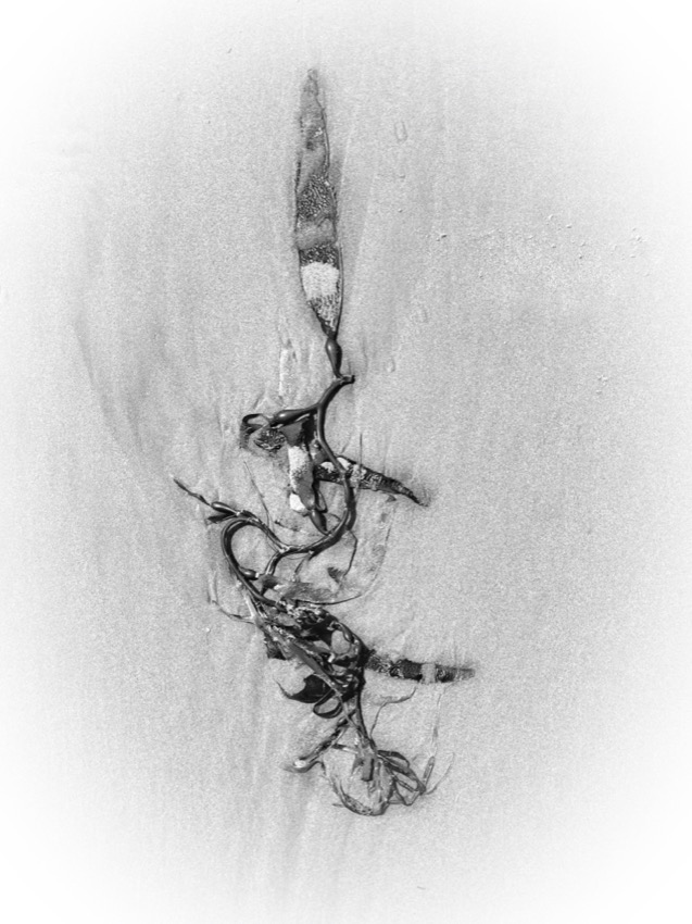 A marée basse, la balade nous fait découvrir des algues aux formes étranges. Elles se sont déposées là au petit bonheur la chance. Tout en marchant on peut vagabonder d’un univers à un autre. Parfois elles font penser aux sinogrammes asiatiques et parfois, ces formes abstraites laissent libre cour à l’imagination …